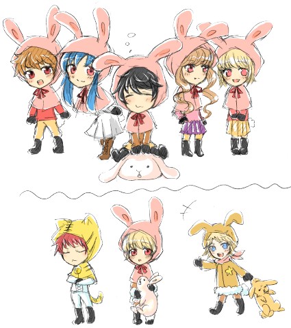 真ん中…うさ吉。五人の少年少女を干支世界に連れてきた少年。なんとかして戦争を終結させようとしている。 おとなしいがニンジンを見るとテンションが上がる。(うさぎ)…ゲンジ。卯年エリアに住むうさぎ。少々乱暴な言葉遣いで話し、うさ吉をサポートする。