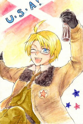 絵は髪・肌・軍服は水彩絵の具で、上着や背景のもやもやしたのは水彩鉛筆で描きました。
